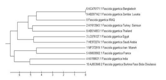 Phylogenetic relationship with global isolates based on ITS1 sequence of F. gigantica isolated from the liver of sheep in Iraq.