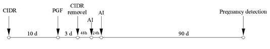 Schedule of Synchronization of estrus with CIDR and PGF treatments and pregnancy detection for Dehong dairy buffaloes.