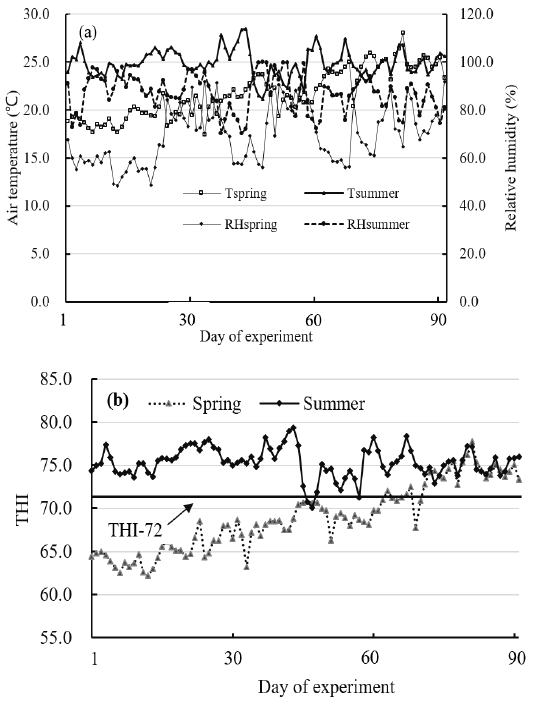 The profile of the indoor daily average temperature (°C), relative humidity (%) and THI. Tspring, Tsummer, RHspring and RHsummer indicated average temperature and relative humidity (%) in spring and summer, respectively.