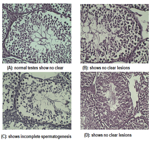 Histopathological sections in testis of control (A), mice consumed high concentration energy drink for 10 days (B), for 20 days (C), and consumed low concentration energy drink for 20 days (D)