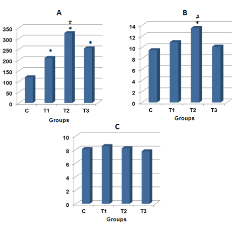 platelets (PLT)PLT×109 cell/ml2(A), while blood cells (WBC) WBC×109cell/ml2(B), and red blood cells (RBC) RBC×1012 cell/ml2(C),counts in the control (C) and mice consumed energy drink groups; high concentration for 10 days (T1), for 20 days (T2), and low concentration for 20 days (T3). *Significant differences in control vs. consumed energy drink groups, #Significant differences among consumed energy drink groups.
