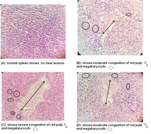 Histopathological sections in spleen of control (A), mice consumed high concentration energy drink for 10 days (B), for 20 days (C), and consumed low concentration energy drink for 20 days (D)