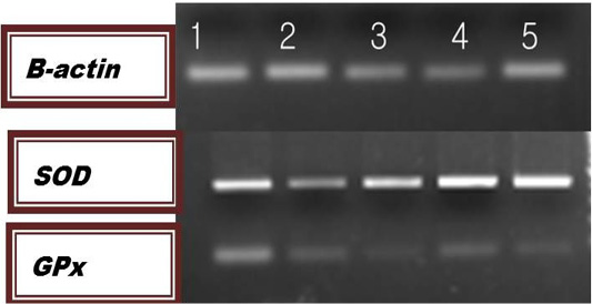 Agarose gel Electrophoresis of the PCR products for the examined genes. Lane Lane 1: farm1; lane 2: farm 2; lane 3: farm 3: lane 4: farm 4; lane 5: farm5.