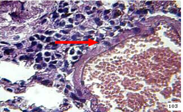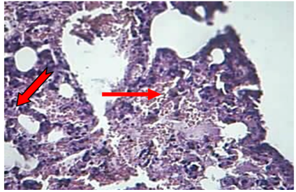 The lung at 72hr post infection explained fibrin ( ), RBC and neutrophils ( ) in the alveolar space and lumen of BVs (H&Estain 40X)