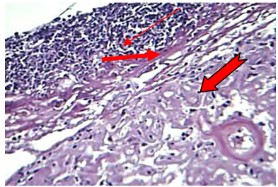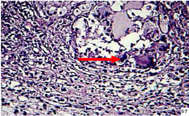 The liver at 72hr post infection shows amyloid ( ) like substance replacement hepatic cells with neutrophils in dilated sinusoids and central vein, fibrin ( ) deposition and aggregation of neutrophils ( ) in capsular region with fragment of hyphae (H&E stain20X)