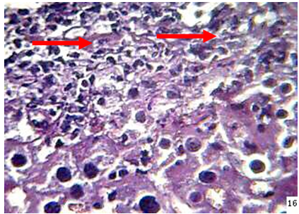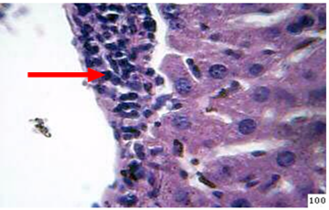 Histopathological section in the liver of treated animal with β-glucan at 45day post infection shows mononuclear cells ( ) aggregation around central vein and kupffer cells prolifration (H&E stain 40X)