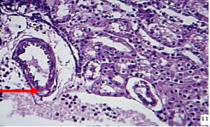 kidney at 72hr post infection shows neutrophils ( ) around and in the lumen of BVs between renal tubules (H&EX)