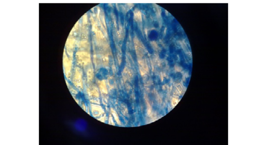 Absidia spp. Microscopically. Nonseptate hyphae, funnel-shaped under sporangium, sporangiophore widens and round sporangiospores.(40X lens)