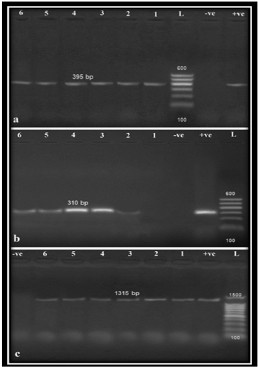 Agarose gel amplification for PCR products specific for S. aureus isolates on Nuc (a), Mec A (b) and Ica A (c) genes amplified 395 bp, 310 bp and 1315 bp, respectively. Lane (L): 100 bp Ladder ‘’Marker’’, Lanes (1–6): examined samples, Lane Pos: Positive control, Lane Neg: Negative control.