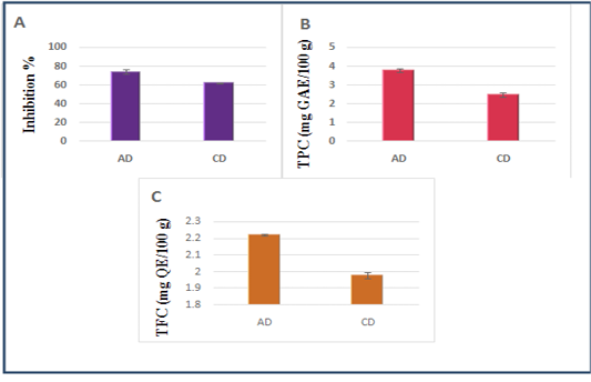 A- DPPH radical scavenging activity of the diets, B- Phenolics contents of the diets (mg GAE/100 g DM), C- Flavonoids contents of the diets (mg QE/100 g DM). Data are presented as mean ± SEM, n = 3 experiments, p values; *p < 0.05, **p < 0.01,***p < 0.001. AD: Diet including Argane sub products; CD: Control diet.