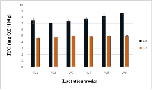 Flavonoids contents of camel milk (mg QE/100 g DM) as related to diet type and lactation stage. Data are presented as mean ± SEM, n = 3 experiments, p values; *p < 0.05, **p < 0.01, ***p < 0.001. AD: milk collected from camel fed by diet including Argane sub products; CD: milk received from camel fed by local diet.