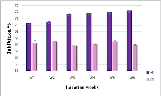 DPPH radical scavenging activity of camel milk as related to diet type and lactation stage. Data are presented as mean ± SEM, n = 3 experiments, p values; *p < 0.05, **p < 0.01, ***p < 0.001. AD: milk collected from camel fed by diet including Argane sub products; CD: milk received from camel fed by local diet.