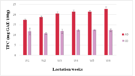 Phenolics contents of camel milk (mg GAE/100 g DM) as related to diet type and lactation stage. Data are presented as mean ± SEM, n = 3 experiments, p values; *p < 0.05, **p < 0.01, ***p < 0.001. AD: milk collected from camel fed by diet including Argane sub products; CD: milk received from camel fed by local diet.