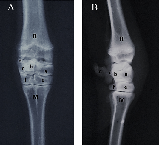 Radiographs of the carpal joint. (A) Dorsopalmar view, (B) Lateromedial view. R- Radius; M- Metacarpus; a- Radial carpal bone; b- Intermediate carpal bone; c- Ulnar carpal bone; d- Accessory carpal bone; e- Fused second, third carpal bone; f- Fourth carpal bone.