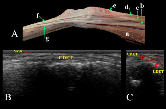 Lateral aspect of the carpal region. (A) Photomacrograph. Ultrasonographic imaging of the dorsolateral aspect of the carpal region: (B) LS and (C) TS. a- Ulnaris lateralis; b- Lateral digital extensor M.; c- Common digital extensor M. lateral belly; d- Common digital extensor M., medial belly; e- Extensor carpi obliqus M.; f- Tendon of common digital extensor; g- Tendon of lateral digital extensor M; LDET- Lateral digital extensor tendon; CDET- Common digital extensor tendon.
