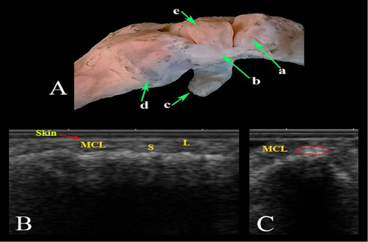 Medial collateral ligament of the carpal joint. (A) Photomacrograph. Ultrasonographic imaging: (B) LS, (C) TS. a- Radius; b- Medial collateral ligament; c- Accessory carpal bone; d- Metacarpal bones; (e) Radial carpal bone; MCL- Medial collateral ligament; L- Long fibers; S- Small fibers.