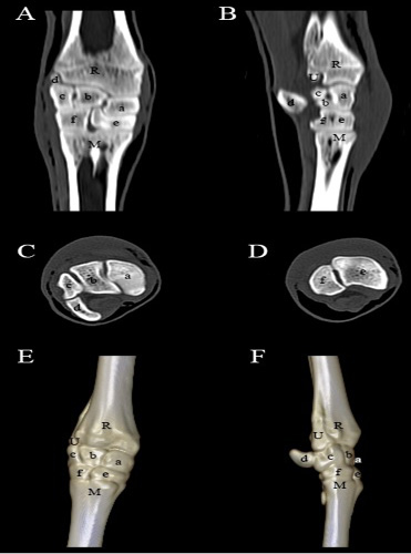Computed tomography of the carpal joint. (A) Coronal view, (B) Sagittal scanning, (C) Axial scanning of the first raw of the carpal bones, (D) Axial scanning of the second raw of the carpal bones, (E) 3D image of the dorsopalmar aspect of the carpal joint, (F) 3D image of the lateromedial aspect of the carpal joint. R- Radius; U- Ulna; M- Metacarpus; a- Radial carpal bone; b- Intermediate carpal bone; c- Ulnar carpal bone; d- Accessory carpal bone; e- Fused second, third carpal bone; f- Fourth carpal bone.