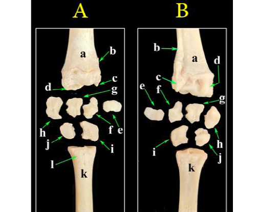 A photograph of bones of the carpal region. (A) Dorsal view, (B) palmar view. a- Radius; b- Ulna; c- Styloid process of ulna; d- Radial articular facets; e- Accessory carpal bone; f- Ulnar carpal bone; g- Intermediate carpal bone; h- Radial carpal bone; i- Fourth carpal bone; j- Fused second and third carpal bone; k- Metacarpal bones; l- Metacarpal tuberosity.
