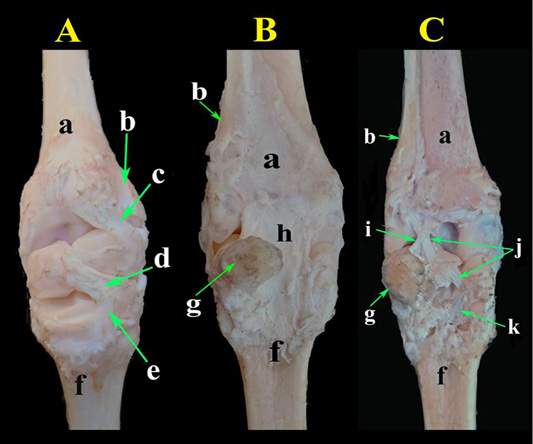 Photomacrographs of the special ligaments of the carpal joint. (A) Dorsal view, (B) Palmar view and (C) Palmar view after removal of the common palmar carpal ligament. a- Radius; b- Ulna; c- Dorsal radiocarpal ligament; d- Dorsal intercarpal ligament; e- Dorsal carpometacarpal ligament; f- Metacarpal bones; g- Accessory carpal bone; h- Common palmar carpal ligament; i- Palmar radiocarpal ligament; j- Palmar ulnocarpal ligament; k- Palmar carpometacarpal ligament.