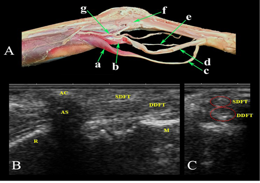 Palmar aspect of the carpal region. (A) Photomacrograph of the deep dissection of the forearm region and carpal canal. Ultrasonographic imaging: (B) LS and (C) TS. a- Superficial digital flexor M.; b- Deep digital flexor M.; c- Superficial digital flexor tendon; d- Deep digital flexor tendon; e- Median Nerve.; f- Carpal canal opened; g- Median Artery; AC- accessory carpal bone; AS- Acoustic shadow; SDFT- Superficial digital flexor tendon; DDFT- Deep digital flexor tendon; R- Radius; M- Metacarpus.