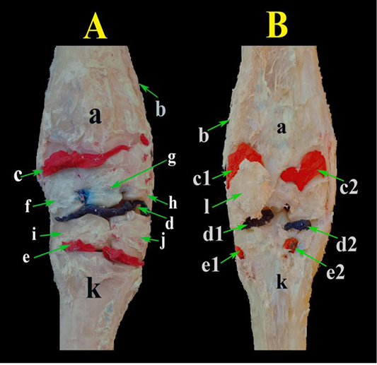 A photograph showing the carpal joint capsule injected with a colored latex. (A) dorsal view and (B) palmar view. a- Radius; b- Ulna; c- Antebrachial-carpal sac; c1- Lateral extension of antebrachial-carpal sac; c2- Medial extension of antebrachial-carpal sac; d- Middle carpal sac; d1- Lateral extention of of middle carpal sac; d2- Medial extension of of middle carpal sac; e- Carpometacarpal sac; e1- Lateral extension of of carpo-metacarpal sac; e2- Medial extension of of carpo-metacarpal sac; f- Radial carpal bone; g- Intermediate carpal bone; h- Ulnar carpal bone; i- Fused second, third carpal bone; j- Fourth carpal bone; k- Metacarpal bones; l- Accessory carpal bone.