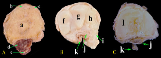 Photomacrograph of the cross sections at different levels of the carpal region. (A) At the distal extremity of radius, (B) At the middle carpal bones, (C) At the metacarpus. a-Radius; b- Extensor carpi radialis M.; c- Common digital extensor M.; d- Deep digital flexor M.; e- Superficial digital flexor M.; f- Radial carpal bone; g- Intermediate carpal bone; h- Ulnar carpal bone; i- Accessory carpal bone; j- Deep digital flexor tendon; k- Superficial digital flexor tendon; l- Metacarpal bones.