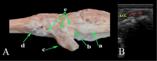 Lateral collateral ligament of the carpal joint. (A) Photomacrograph and (B) TS Ultrasonographic imaging. a- Ulna; b- Ulnar carpal bone; c- Accessory carpal bone; d- Metacarpal bones; e- Lateral collateral ligament; LCL- Lateral collateral ligament.