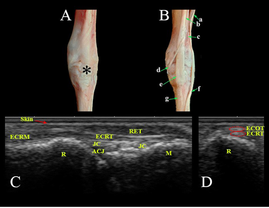 Dorsal aspect of the carpal region. Photomacrographs: (A) superficial layer and (B) deep layer. Ultrasonographic imaging: (C) Longitudianl scan (LS) and (D) Transverse scan (TS) at the level of the radius. *- Extensor retinaculum; a- Common digital extensor M.; b- Extensor carpi radialis M.; c- Extensor carpi obliqus M.; d- Tendon of extensor carpi obliqus M.; e- Tendon of extensor carpi radialis; f- Tendon of common digital extensor M.; g- Metacarpal bones; Ret- Retinaculum; ECRT- Extensor carpi radialis tendon; ECRM- Extensor carpi radialis M.; ECOT- Extensor carpi obliqus tendon; JC- Joint capsule; ACJ- Antebrachiocarpal joint; R- Radius; M- Metacarpus.
