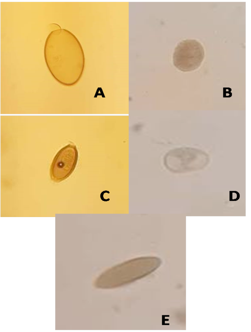 Eggs and sacs of certain parasites isolated from houseflies: (A)Fasciola egg (B)Blantidium coli sac (C)Enterobius egg (D)Entamoeba coli sac (E)Ascaris egg.
