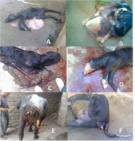 (A) Dead male buffaloes fetal Ascites after delivery by penetrated of abdominal wall and then lubrication and forced extraction the Fetus. (B) Dead buffaloes fetal Hydrocephalus with perosomuselumbis after delivery by Cesarean Section. (C) Dead male buffaloes fetal Anasarca after delivery by Cesarean Section.(D) dead fetal emphysema after delivery by Cesarean Section.(E) Cow-Buffalo suffering from Dystocia due to lateral deviation of the head delivered after correction of the head.(F) Cow- Buffalo suffering from Dystocia due to Incomplete cervical dilatation delivered by Cesarean Section.