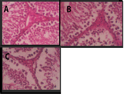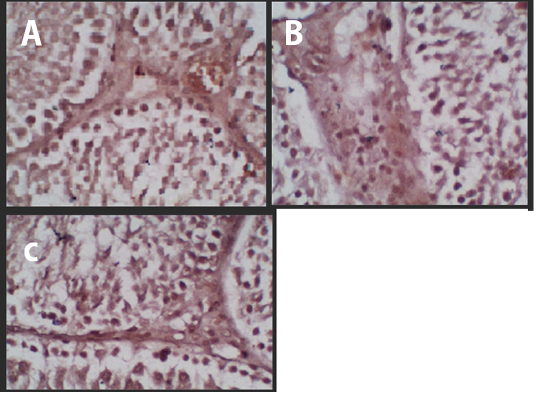 Histology of Leydig cells. (A) Negative Control, (B) Treatment 1 with Cepoka eggplant extract, (C) Treatment 2 with Kapok seed extract.