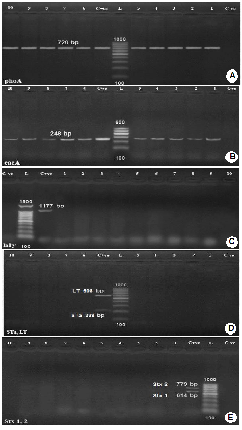 E): Agarose gel electrophoresis of PCR for detection of stx1 and stx2 genes in E. coli isolates.