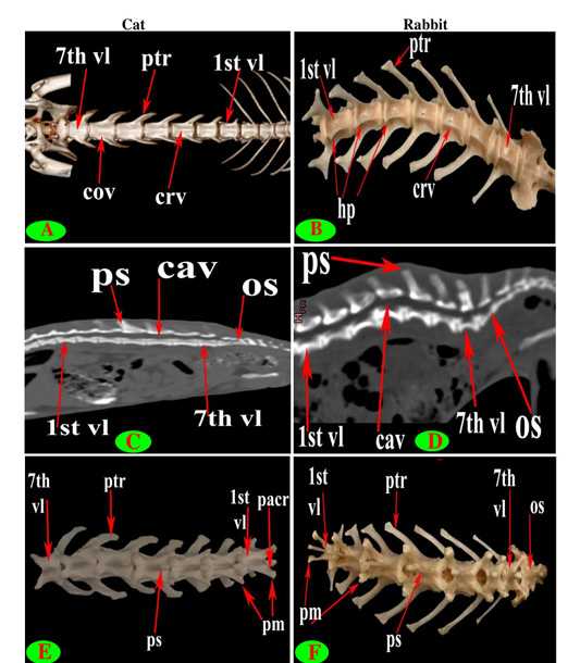 Vertebrae lumbales (vl), Processus spinosus (ps), Processus mamillaris (pm), Processus transversus (ptr), Corpus vertebrae (cov), Processus articularis cranialis (pacr), Hypapophysis (infraspinous processes) (hp), Crista ventralis (crv), Canalis vertebralis (cav) and Os sacrum (os).