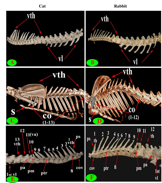 Vertebrae thoracicae (vth), Vertebrae lumbales (vl), Sternum (S), Costae (co), Vertebra anticlinalis (va), Processus spinosus (ps), Processus accessories (pa), Processus mamillaris (pm), Processus transversus (ptr), Foramen intervertebrale (fi) and Corpus vertebrae (cov).