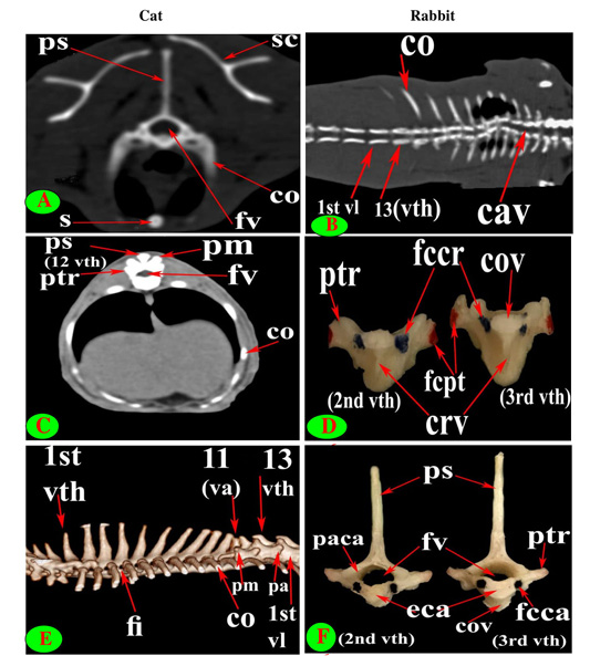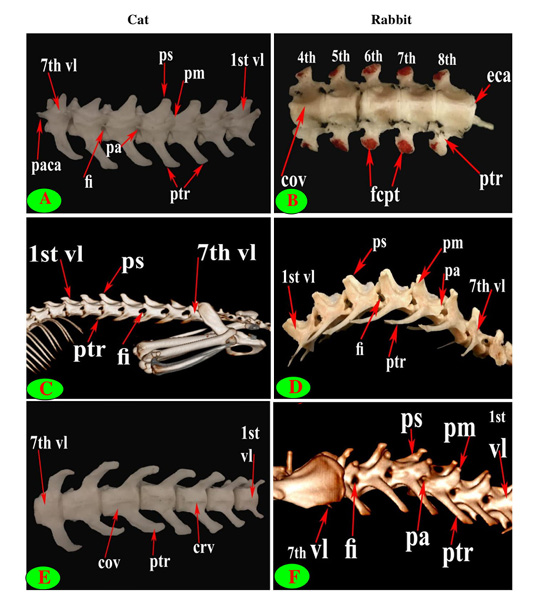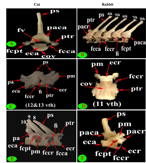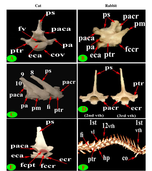 Vertebrae thoracicae (vth), Vertebrae lumbales (vl), Processus spinosus (ps), Processus accessories (pa), Processus mamillaris (pm), Processus transversus (ptr), Foramen intervertebrale (fi), Corpus vertebrae (cov), Fovea costalis processus transversi (fcpt), Crista ventralis (crv), Processus articularis caudalis (paca) and Extremitas caudalis (eca).