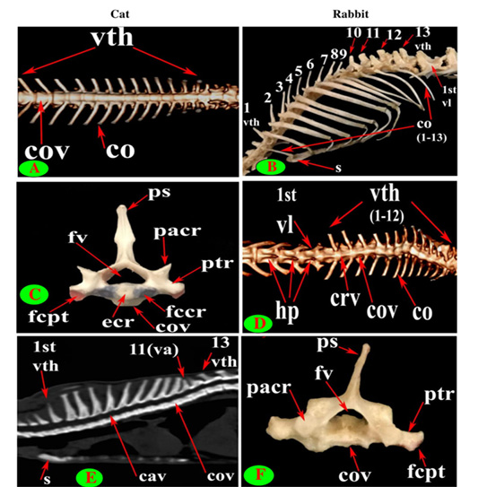 Vertebrae thoracicae (vth), Vertebrae lumbales (vl), Costae (co), Processus spinosus (ps), Processus accessories (pa), Processus mamillaris (pm), Processus transversus (ptr), Foramen intervertebrale (fi), Corpus vertebrae (cov), Foramen vertebrale (fv), Fovea costalis processus transversi (fcpt), Extremitas cranialis (ecr), Fovea costalis cranialis (fccr), Processus articularis cranialis (pacr), Hypapophysis (infraspinous processes) (hp), Processus articularis caudalis (paca) and Extremitas caudalis (eca).