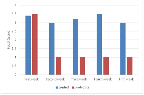 Mean fecal score of neonatal buffalo calves supplemented with or without probiotics. Calve diarrhea was evaluated using the fecal score and recorded according to Larson et al.’s recommendation (1977). For fecal fluidity, scoring was done as follows: 1 = normal, 2 = soft, 3 = runny and 4 = watery during the experimental period.
