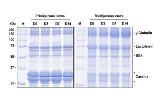 Images of γ-globulin, lactoferrin, BSA, and casein bands of the quarter secretion in 10% SDS-PAGE of primiparous cows (A) and multiparous cows (B) during the dry period.