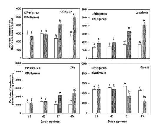 x,y Columns carrying differences superscripts are significantly (P < 0.05) between treatment (primiparous and multiparous cows) at the same time point