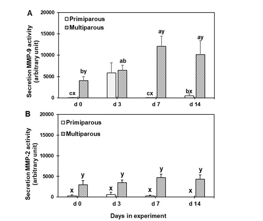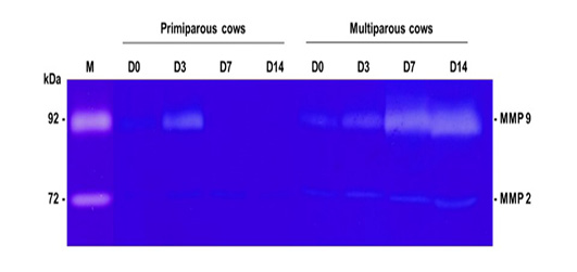 Images of MMP-2 and -9 bands of the quarter secretion in Gelatin Zymogram for both primiparous and multiparous cows.