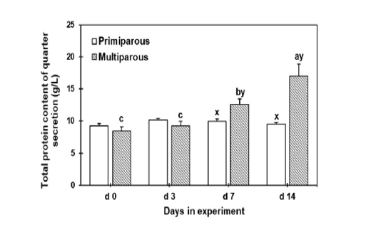 The total protein concentration of mammary secretion during the dry period for both primiparous and multiparous.