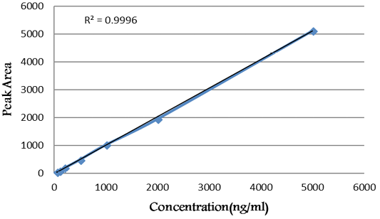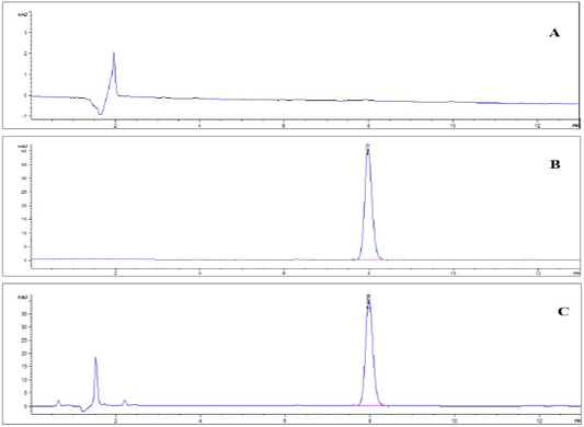 HPLChromatogram of (A) blank muscle sample; (B) diclazuril pure standard solution at a concentration of 500 ng/ml. and (C) spiked muscle sample at a concentration of 500 ng/gm.