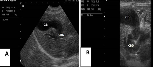 (A): Sagittal ultrasonographic image of gallbladder (GB) and common bile duct (CBD) in dog before surgery, 2.7mm; (B): the image showed the maximum dilatation of gallbladder (GB) and common bile duct in the 2nd week after ligation, 14.9mm.