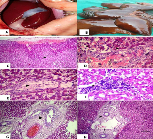 (A): showed normal liver before surgery; (B): Liver showed necrosis and firm in consistency after ligation and showed multiple grayish necrotic areas. Photomicrograph of HandE stained liver tissue; (C): subcapsular hemorrhage (arrow) and vacuolation in some hepatocytes (arrow head), 100 bar; (D): congestion of central vein (black arrow), vacuolation in some hepatocytes (white arrow) and yellowish brown granules of bile pigment inside other hepatocytes (arrow head), 20 bar; (E): fatty change of some hepatocytes (arrow head) and disassociation of other hepatocytes (white arrow) with yellowish brown granules of bile pigment inside hepatocytes HandE 20 bar; (F): the focal aggregation of lymphocytes with few macrophages infiltrations replaced necrotic hepatocytes (arrow head) and vacuolation in other hepatocytes, 20 bar; (G) Chronic cholecystitis represented by hyperplasia of its lining epithelium and thickening in the wall of gall bladder with fibrous tissue proliferation (arrow head) and chronic cholangitis (arrow), 100 bar; (H) Dilation of portal vein (black arrow) with chronic cholangitis represented by thickening in the wall of bile duct with fibrous tissue proliferation (arrow head), 100 bar.