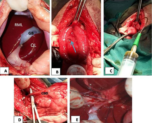 (A) The mid line incision at the epigastric region in liver area, RML: right medial lobe of liver, GB: gallbladder, QL: quadrate lobe; (B): image showed duodenal incision and exposure of major duodenal papilla (arrow); (C): the image showed bile aspiration; (D): the image showed common bile duct (CBD) exposure; (E): surgical ligation of common bile duct.