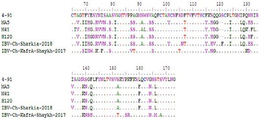 Comparison between deduced amino acid sequences of HVR1 (amino acid position from 60-88) and HVR2 (amino acid position from 115-140) of S1 protein of two isolates reported in the study and currently used vaccine strains in Egypt.