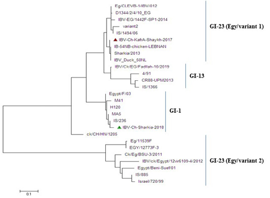 Phylogenetic tree based on nucleotide sequences of S1 gene for the two IBV isolates and related 25 reference IBV strains. The IBV-Ch-KafrAshaykh-2017 isolate marked with a red triangle belonging to isolates of GI-23 lineage (Egy/variant1 group), while IBV Ch-Sharkia-2018 marked with a green triangle belonging to isolates of GI-1lineage (classical group).