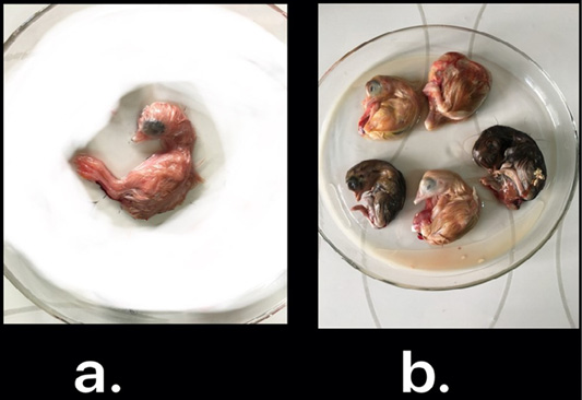 IBV isolated in ECEs. Normal embryo development (a) and curled, stunted, and dwarfed embryos infected with IBV after fourth passage (b)