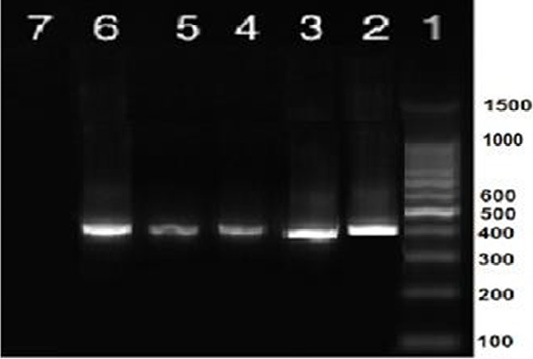 RT-PCR amplification of partial S1 gene from IBV isolates in the present study showed a single specific band (400bp). Lane 1: 1 kbp DNA ladder (Fermantas); Lane 2, positive control; Lanes 3–6: positive IBV-infected samples. Lane 7: negative control.