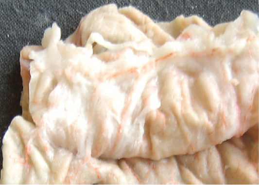 Fragment of the injected part of the abomasum. Vessels of the organ wall are visible.
